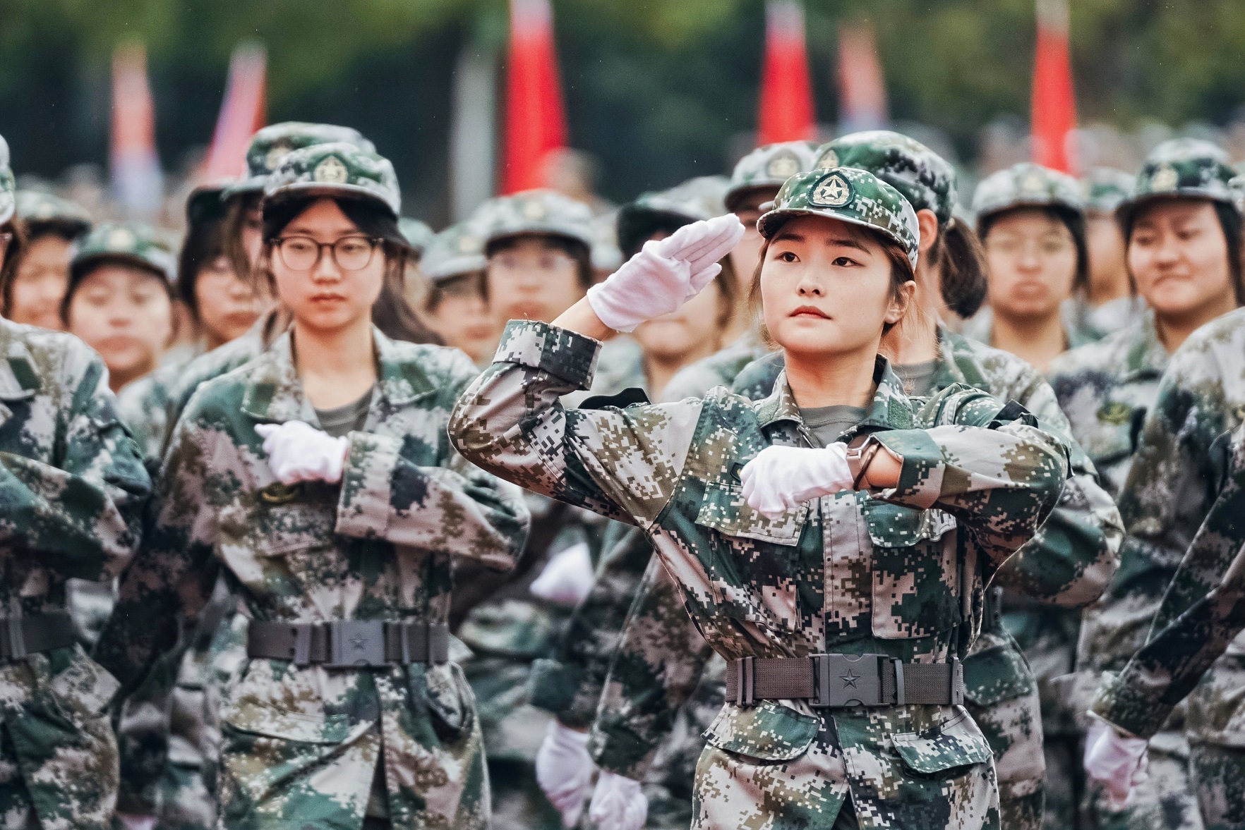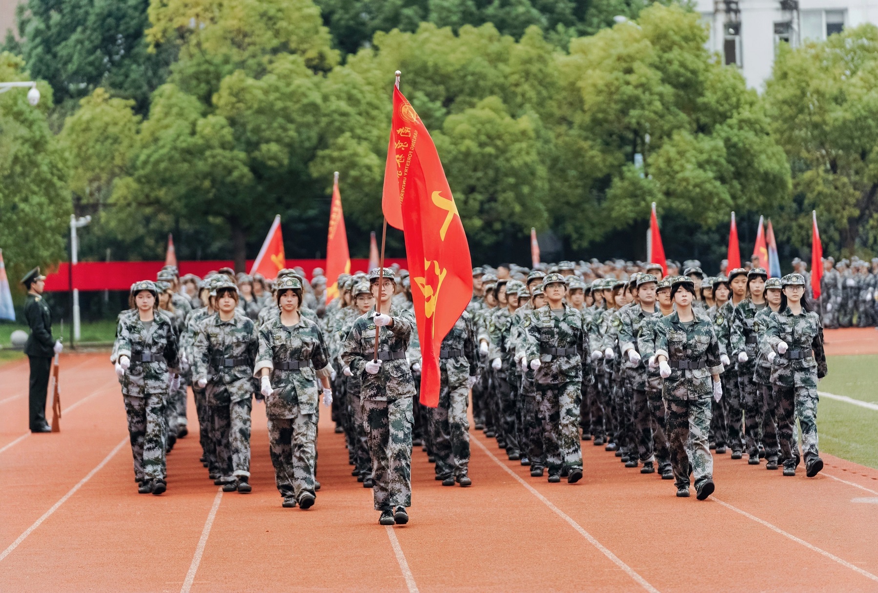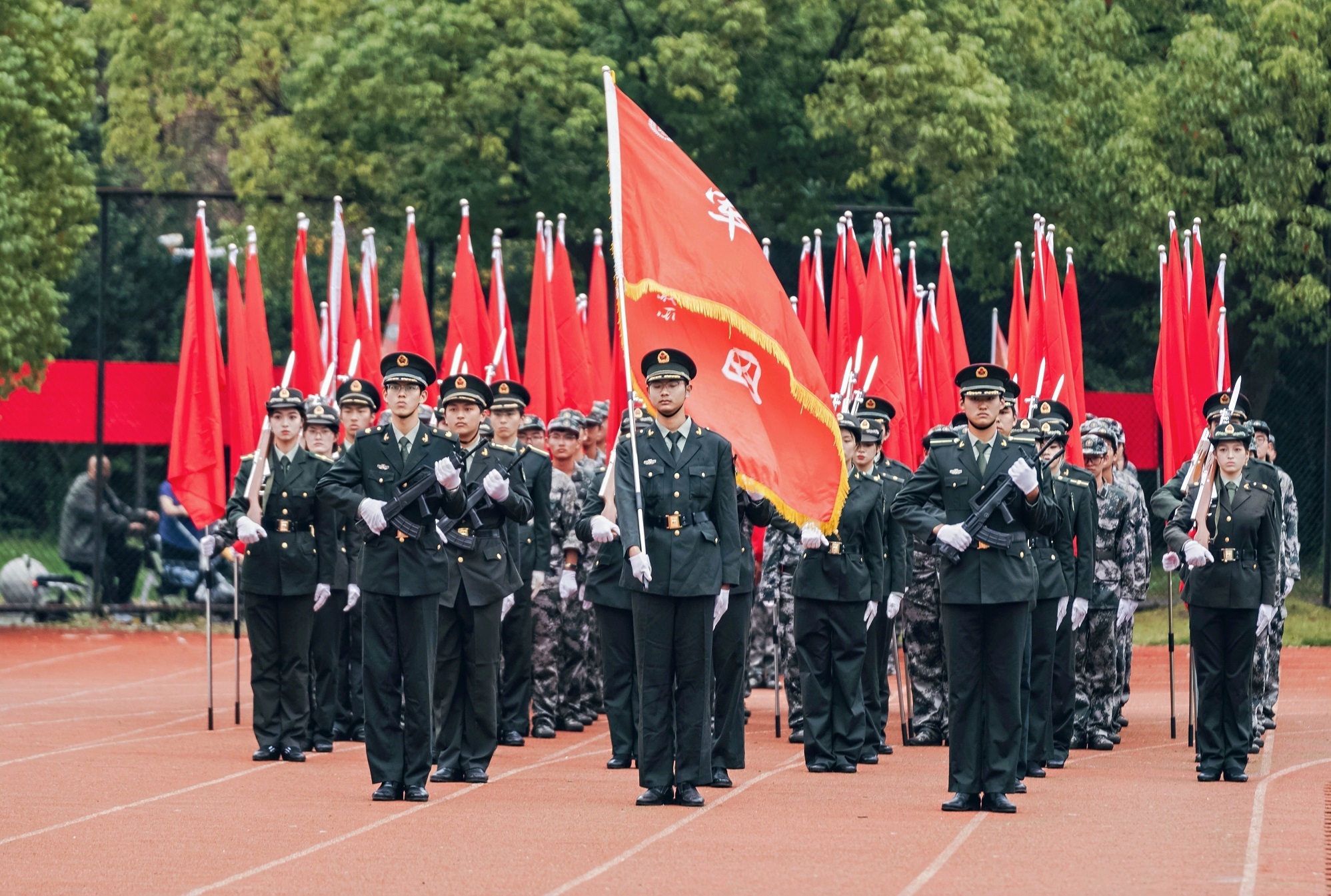 军训汇演场上旌旗迎风招展,气氛庄严肃穆,历经十六天的淬炼与成长,全体参训学子以挺拔之姿、昂扬之态接受检阅。分列式上,接受检阅的各方阵同学们身着整齐戎装,意气风发,迈着铿锵有力的步伐依次经过主席台,尽显蓬勃朝气。
