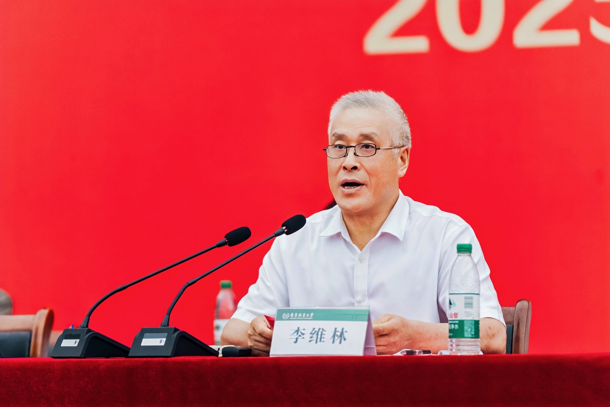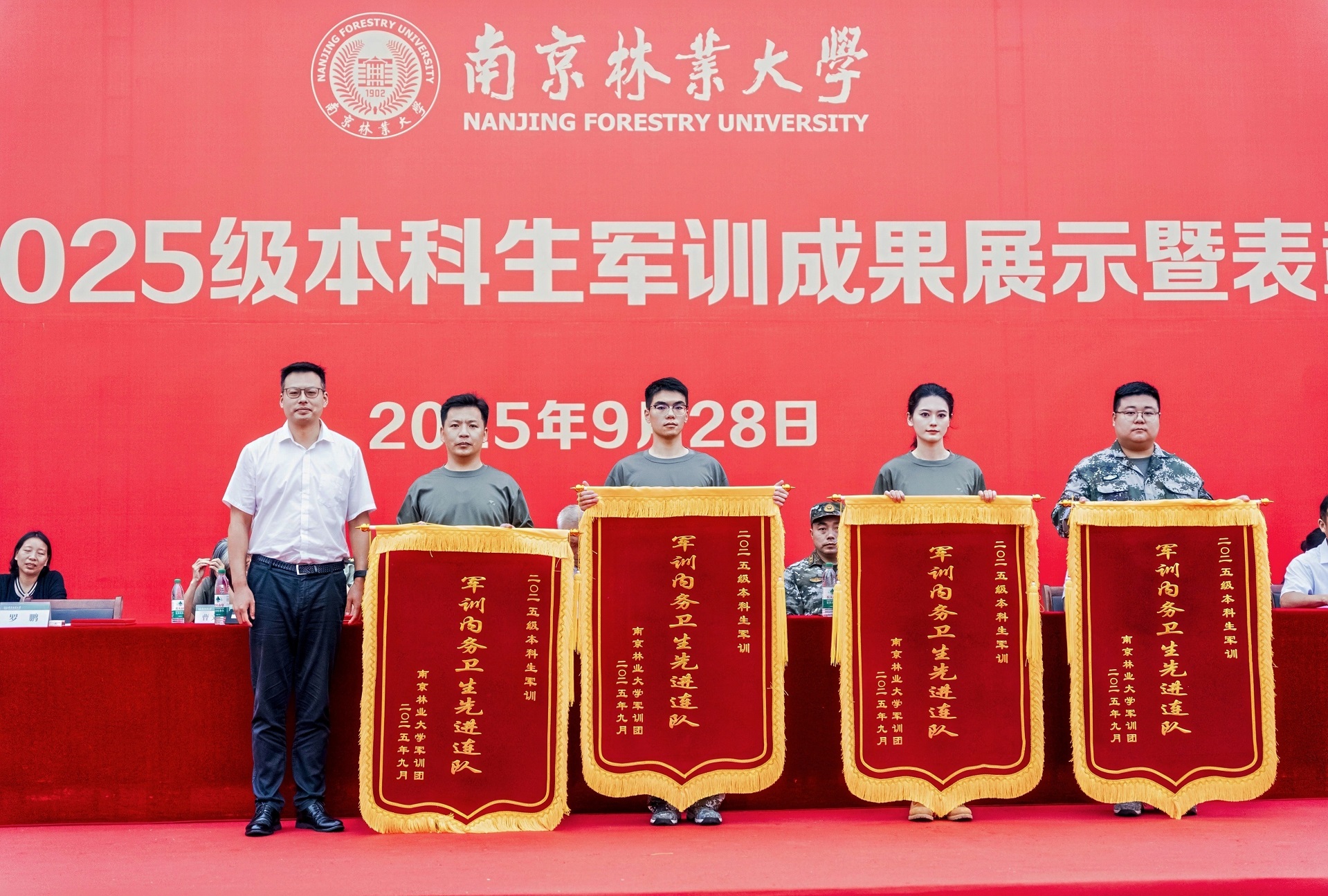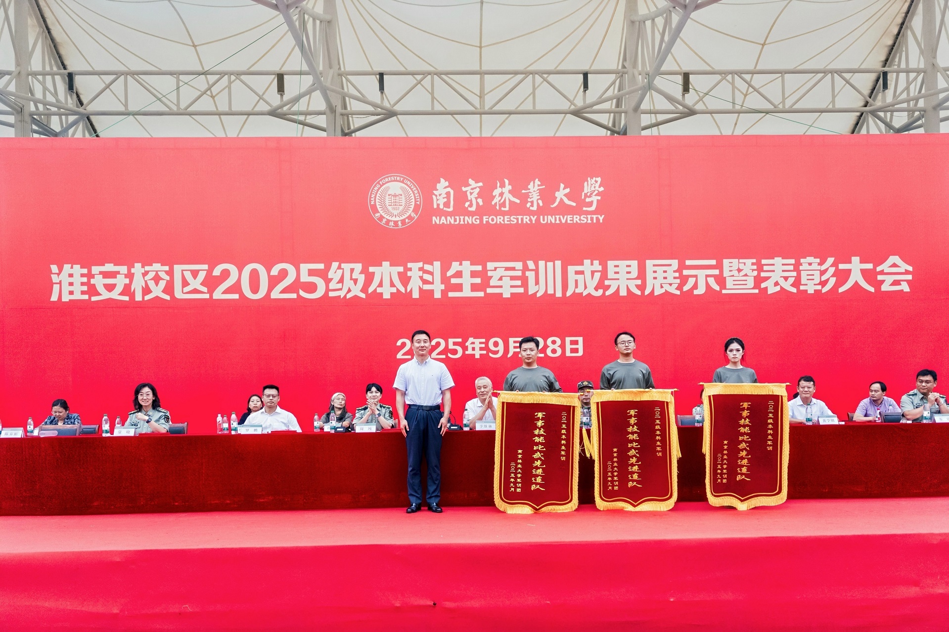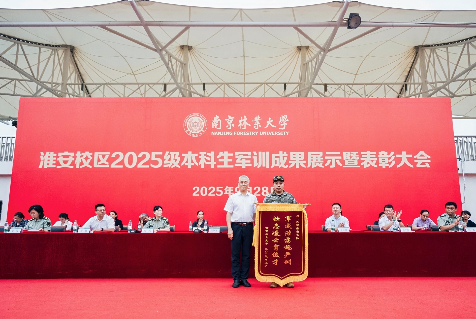 校党委常委、副校长李维林向武警淮安支队赠送锦旗,对他们的辛勤工作表示衷心感谢。同时对即将开启大学生活的2025级同学们提出四点希望:一是,铸忠诚之魂,做红色基因的传承者。淮安这片红色热土烙印着周恩来总理等革命先辈光辉的红色足迹,希望同学们主动传承革命先辈的光荣传统,汲取红色养分,牢记初心使命,铭记历史警示,筑牢爱国根基,将忠诚信仰与报国情怀融入学习生活,成长为担当民族复兴大任的时代新人。二是,立青山之志,做绿色事业的接力者。大学是探求真理的黄金时期,希望同学们将军训淬炼出的“不畏艰难、敢打必胜”意志化为求学路上的持久动力,主动破除“躺平”心态与“内卷”焦虑,珍惜韶华,把专业所学与绿色生态使命相连,既深耕专业知识筑牢根基,也关注绿色发展前沿,让青春在建设美丽中国的实践中发光发热。三是,持实干之姿,做知行合一的新林人。希望同学们勤读“有字之书”夯学识,善学 “无字之书”练真本领,将军人优良作风融入日常。不驰于空想,不骛于虚声,在课堂、实验室、社会实践中踏实前行,知行合一,努力从“新林人”成长为“兴林人”,以实干之姿,助力生态文明建设。四是,扬进取之风,做不负时代的南林人。青春因奋斗出彩,人生因拼搏升华。希望同学们将军训中培养的自律意识与拼搏精神延续到今后的学习生活中,夯实专业、练就本领,以昂扬的姿态追逐理想,将个人成长融入时代发展,用青春力量书写南林人的担当。