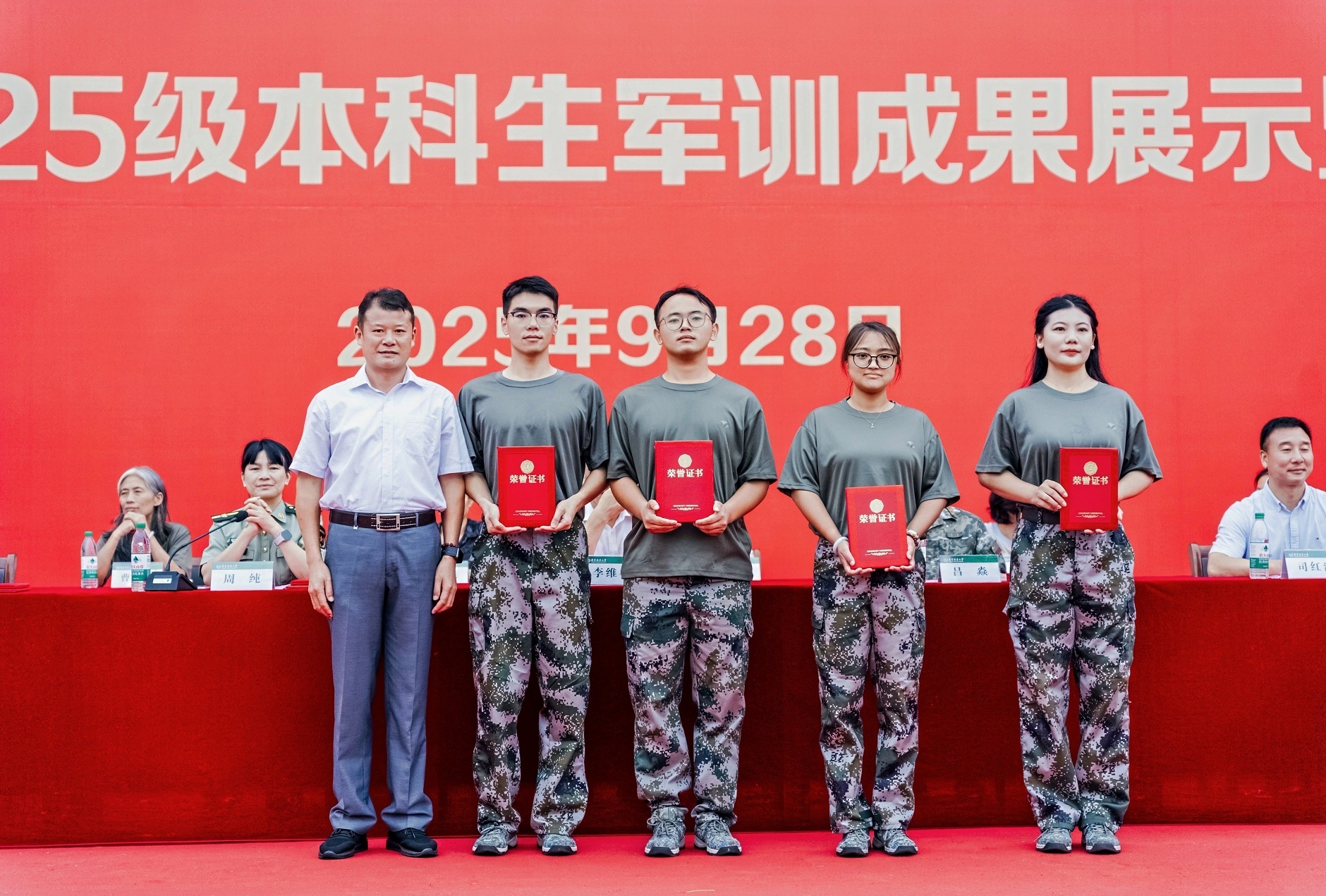 校学生工作部(处)长、武装部部长周纯宣读《关于表彰2025级本科生军训工作先进集体和先进个人的决定》。与会领导先后为受表彰的军事训练先进连队、军事技能比武优胜连队、内务卫生先进连队、军训优秀辅导员、军训先进个人颁发奖牌和获奖证书。