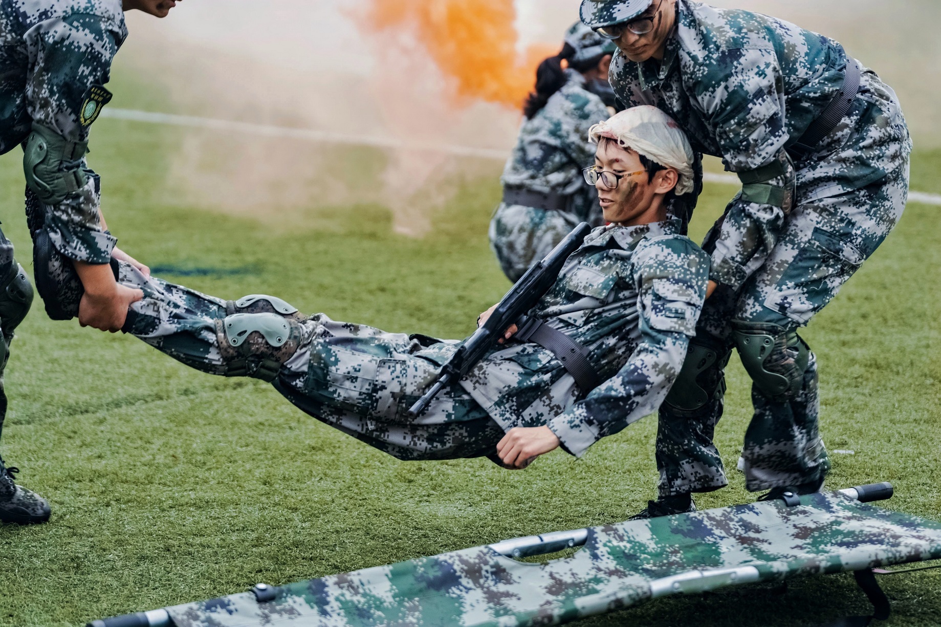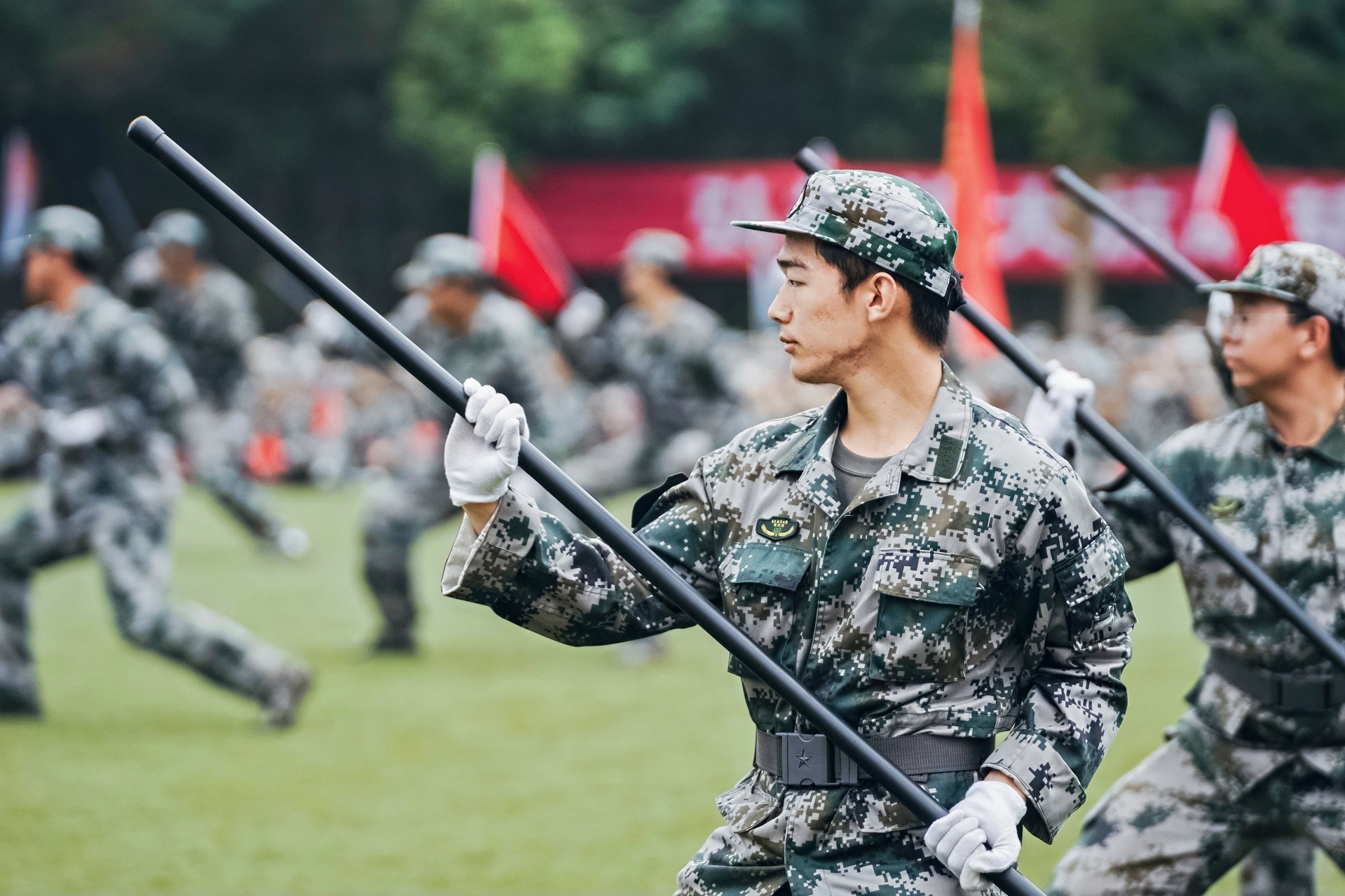 军事科目展演中,擒敌拳刚劲有力、行云流水;女子匕首操、男子应急棍一令一动,一招一式章法有序,气势如虹;战术队形变换迅速,战场救护紧张有序,战术对抗逼真激烈,赢得现场阵阵掌声与喝彩。