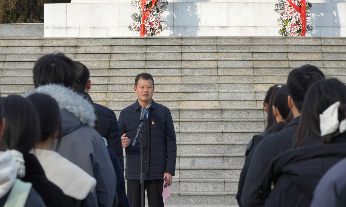 黄学明在讲话中深情回顾了刘老庄八十二烈士为掩护党政军机关转移而浴血奋战、壮烈牺牲的英雄事迹。他指出,英烈精神犹如一座永不熄灭的灯塔,始终照亮我们奋进前行的道路,并对在场青年学子提出三点期望:一要深植信仰之种,筑牢思想根基,从红色历史中汲取精神滋养;二要锤炼过硬品格,做到自律自强,在知行合一中提升能力素养;三要勇担时代重任,将个人理想追求融入国家发展大局,在服务社会中实现人生价值。学生党员代表倪誉源表示,将铭记历史、传承精神,把对先烈的深切崇敬转化为勤学实干、报效祖国的自觉行动。