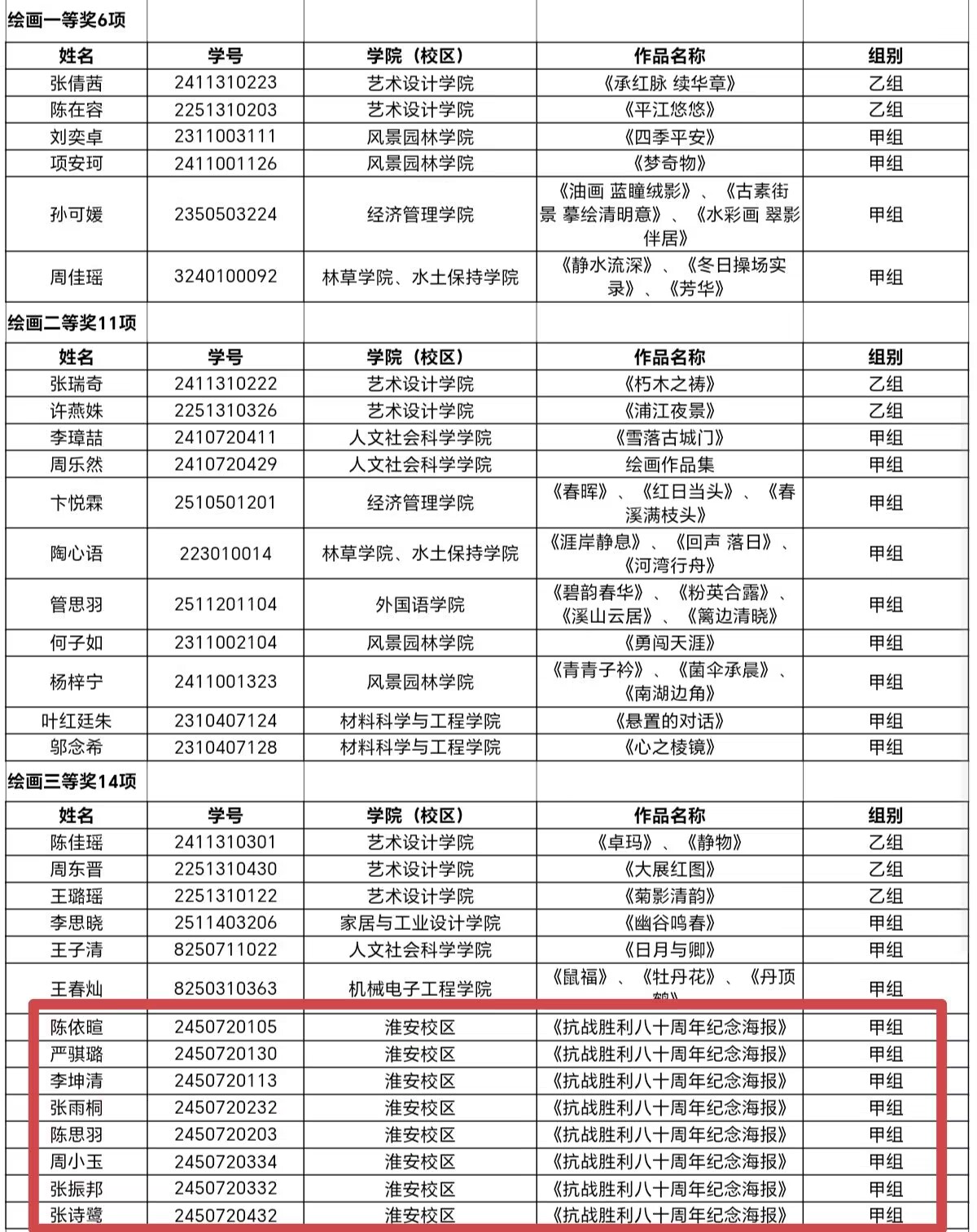 绘画类比赛中,校区学子斩获三等奖8项。陈依暄、严骐璐、李坤清、张雨桐、陈思羽、周小玉、张振邦、张诗鹭八位同学的《抗战胜利八十周年纪念海报》系列作品获评甲组三等奖。作品紧扣时代主题,构思精巧,用画笔传递青年情怀。