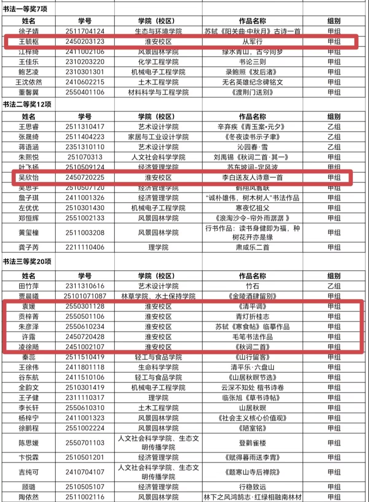 书法赛道上,校区学子收获一等奖1项、二等奖1项、三等奖5项,笔墨生香展书法底蕴。王毓枢的《从军行》获评甲组一等奖,吴欣怡的李白送友人诗意一首拿下甲组二等奖,袁媛、贡梓菁、朱彦泽、许露、凌徐飏五位同学的作品均获甲组三等奖,一撇一捺间尽显中华传统书法之美。